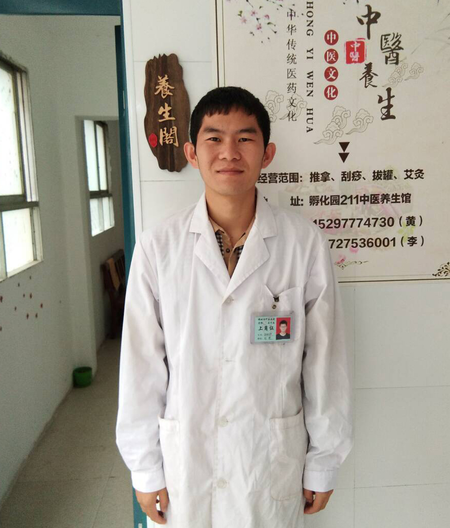 到了大学,黄志荣开始专研中医理疗,成为中医师承弟子,中级按摩师。在偶然一次为中医药学院一位老师做推拿中,得到老师的赞赏,并在其鼓励下创办养生阁,入驻孵化园211。